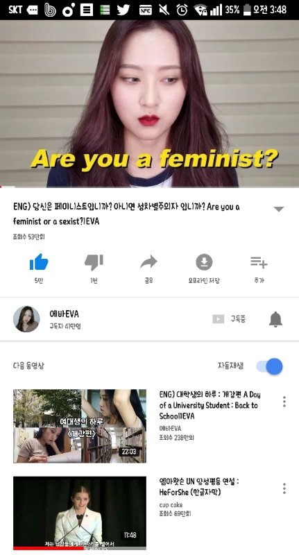 유튜브에 에바 라고 검색하면 나오는 분이 있는데 페미니스트 관련 영상을 올리신 적이 있어! 어떤 영상인지 못 찾는 애들은 아래 사진 참고해줘 이분은 예전에 학교 교양 수업으로 여성학 강의를 들으시면서 이쪽에 관심을 가지게 되신 케이스래 나도 이 영상 보고 페미에 대해 알게 된게 꽤 많아 다들 영상 한번씩만 봐주라!
