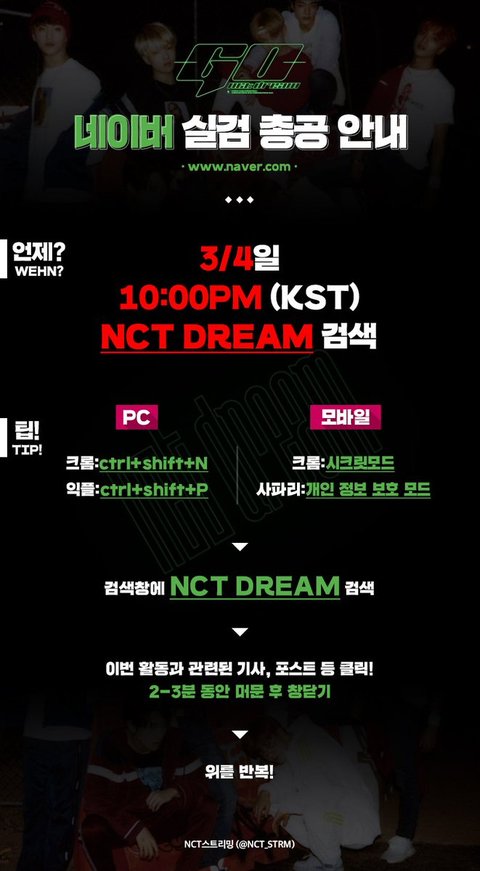 시크릿 또는 개인정보 모드 창에서 "NCT DREAM" 검색 후 보이는 뉴스기사 등을 클릭하여 2~3분 머문뒤 닫고 다시 검색을 반복! (11시 부터는 트위터 총공 시작, 네이버 가능하신분들 계속 해주세요!)잠시 후 드림 네이버 검색어 총공 시작합니다!