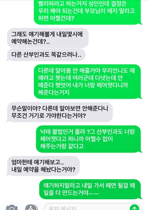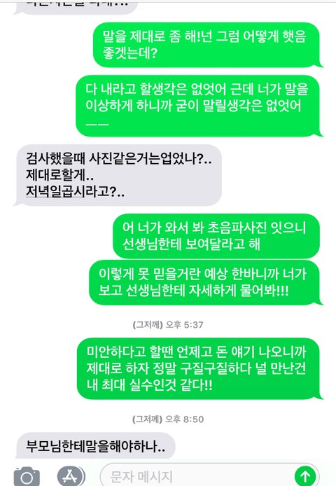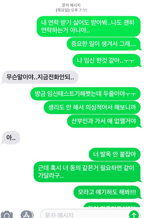 몬가 이상한 맘에 ..임신기테스트를 해봤습니다 ..그런데 왠걸 두줄이 나와버리고 말았습니다 ..산부인과를 다시 가서 받아보니 맞다고 했습니다 ..저는 임신기 테스트를 하고 바로 걔한테 전화하니 안 받더군요..그래서 문자를 남겻죠 근데 처음에는 미안하다 그러더니 나중에 낙태 수술비를 알려주며 돈을 요구하니 저를 무슨 쓰레기 취급하며 딴애 아니냐고 자기 돈 없다고