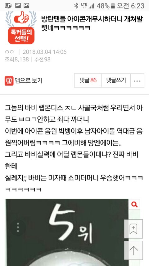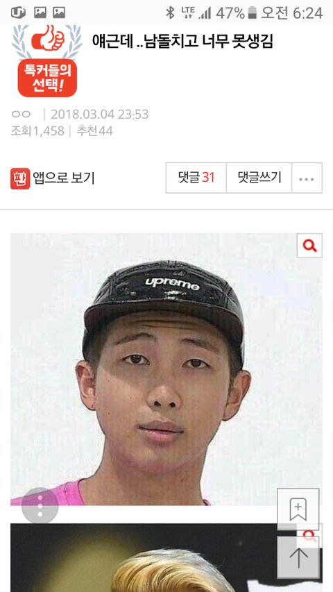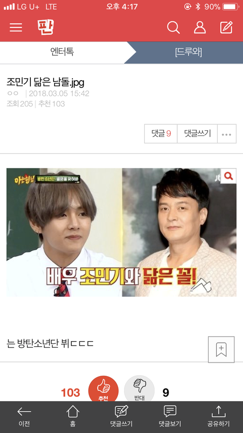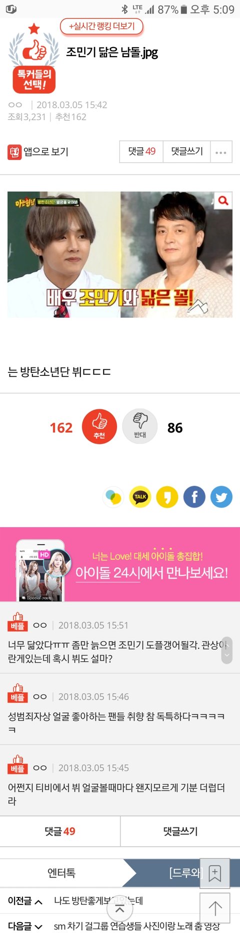 타가수랑 외모 비교글엔 백프로 방탄멤버한명은 있고 그 목적은 방탄영업을 가장한 까판이지