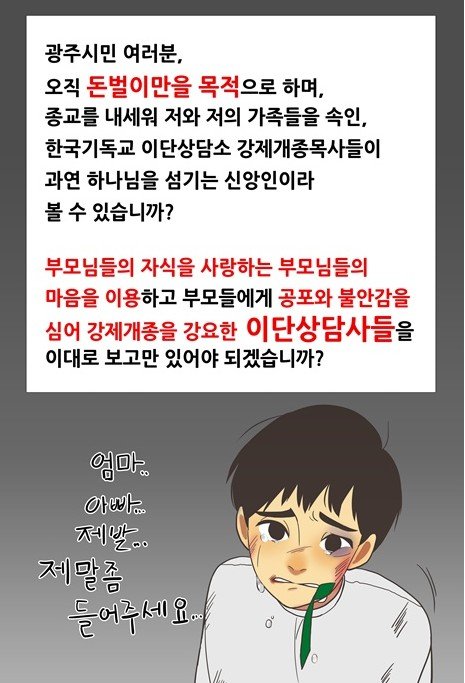 현재 이 순간에도 어디에선 살려달라고 외치는 호소가 들려오고 있습니다.이러한 인권유린의 실체인 강제개종이 근절되기 위해서,제 2의 피해자가 생기지 않기 위해선 여러분들의 힘이 필요합니다.단순 가족문제가 아닌 개종목사의 범법행위가 근절되도록 함께 마음모아 주시기 바랍니다!