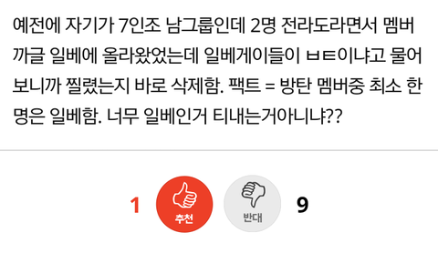 예전에 자기가 7인조 남그룹인데 2명 전라도라면서 멤버까글 일베에 올라왔었는데 일베게이들이 ㅂㅌ이냐고 물어보니까 찔렸는지 바로 삭제함. 팩트 = 방탄 멤버중 최소 한명은 일베함. 너무 일베인거 티내는거아니냐??
