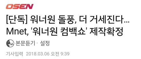 기사)워너원 돌풍, 더 거세진다…Mnet, '워너원 컴백쇼' 제작확정