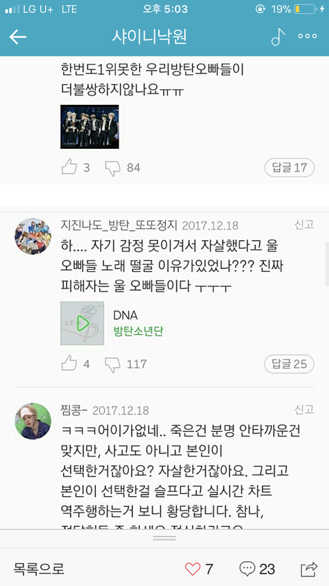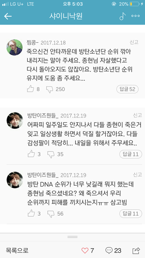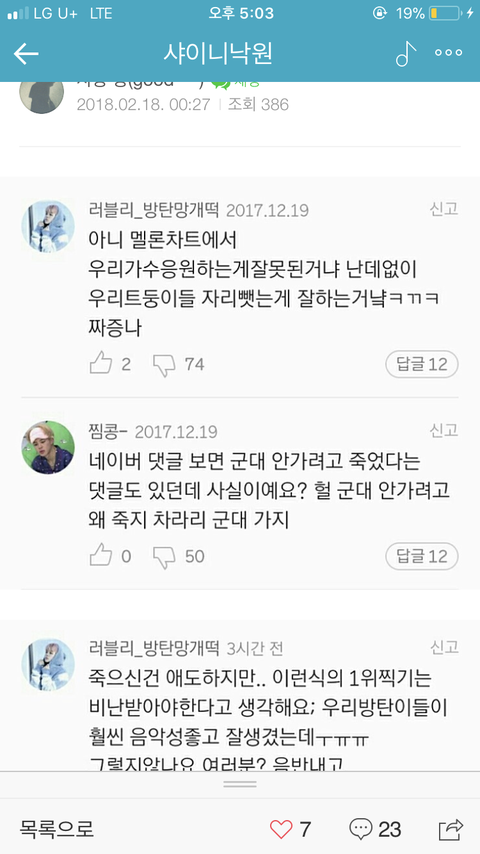 멜론에서 타가수 타팬덤 이름 걸고 우리 앨범 댓글에 저런 난리 쳐놓은 애들 싹 끌고 와 볼까? 호석이 좋은 소식 하나 들려오는 게 그렇게 아니꼬와서 그새를 못 참고 또 온몸이 근질거리디?
