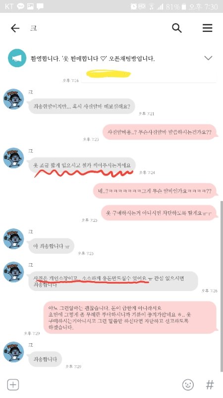 꼭 옷 파는 게 아니더라도 사기 조심하고 저런 사람들 조심해ㅠㅠㅠㅠ 사진 보내줄 때도 너 사진이라는 걸 표시해놓고!! 도용 못하게!!!!!!!