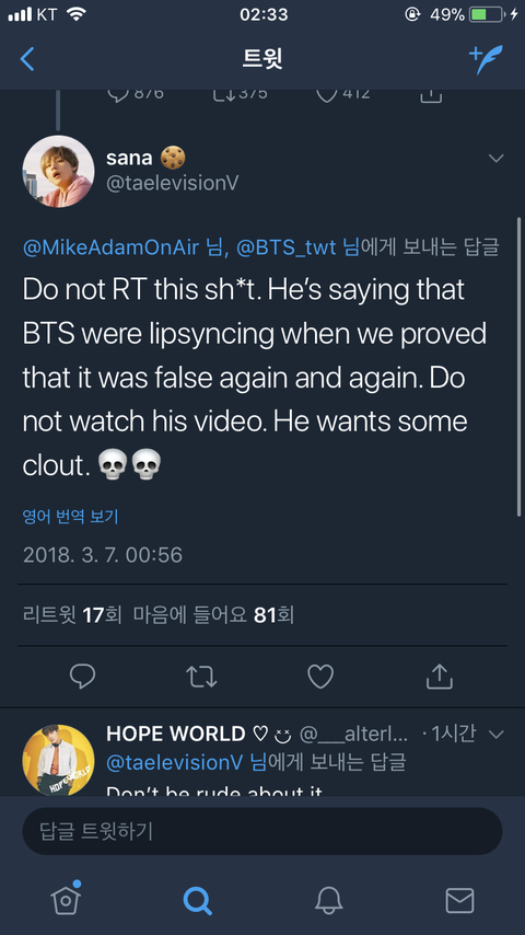 Mike adam <- 이 사람 미국 DJ 인데 울 탄이들한테 호의적인 줄 알았는데 트윗 내용들 보니 립 싱크 한다는 둥 안티인 거 같아. 혹시 보게되더라도 해시 내용 맞아도 툽 하지 말아주라