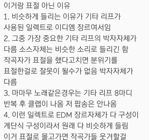 곡이 표절이려면 코드, 진행방식, 믹싱(분위기), 멜로디, 리프(리드) ,컨셉 등등을 의도적으로 베낀 것이거나 완전 똑같은 수준일때 표절이라고 하는거야..
