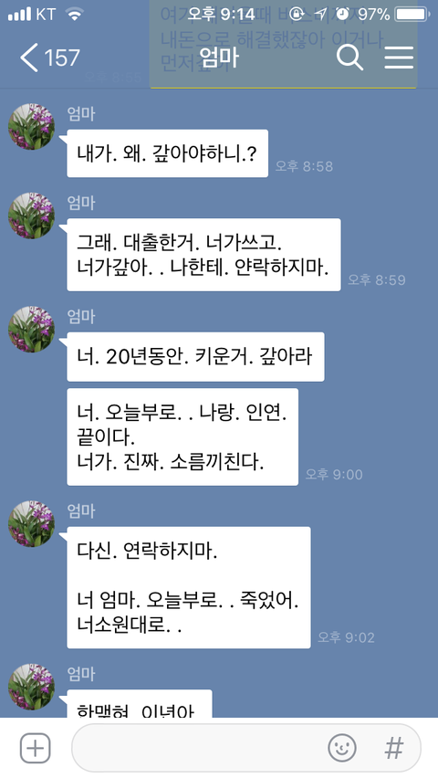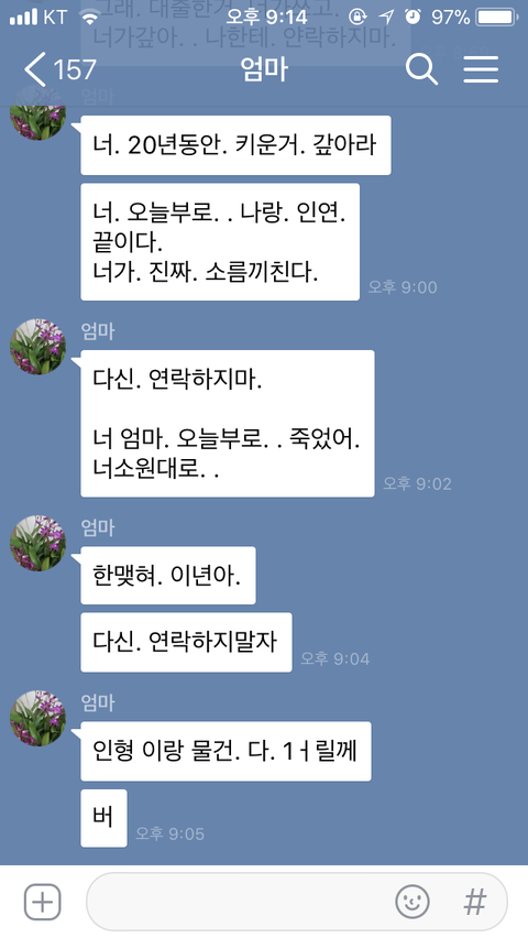 본인 배아파 낳은 딸한테 말을 너무 함부로하시네 개ㄴ이라니? 말끝마다 이년에 사람새끼가 아니라고? 미쳤다 말로만 들었지 저런엄마 진짜 존재하는구나;