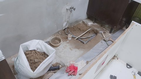 와서 누수탐지기 사용 후, 싱크대 밑이 수상하다며 싱크대를 뜯음. (여기서 싱트대 밑이 저번 공사후 시멘트도 안발라놔서 흙만 덮어져있었음)