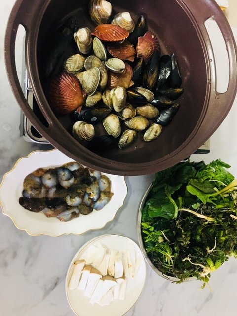 수산시장 갔다가 해삼이랑 조개 사와서 조개 샤브샤브 해먹었어요. 새조개도 있는데 어디 숨었네요.