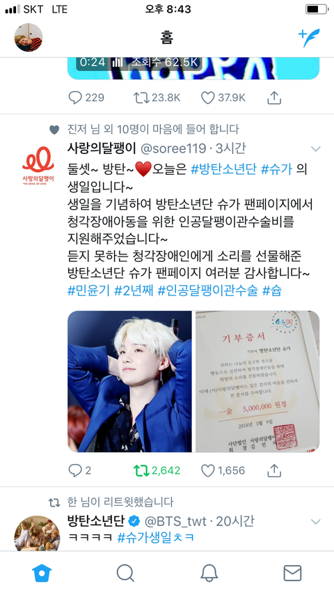 슈가의 생일을 맞이해서 슈가 팬페지이에서 청각장애아동 인공달팽이관수술비 500만원 지원해줬대