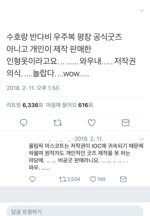 한 줄 요약-IOC가 저작권 가진 수호랑 반다비로 모 아이돌 팬들이 인형 만들어서 금전적 이익 챙김
