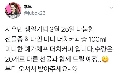 짹에 시우민팬분이 더치커피 나눔 하신대!! 과연 커피요정님의 팬들 답다ㅋㅋㅋ