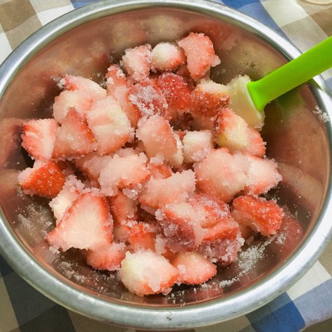 썰어둔 딸기랑 설탕이랑 레몬즙(생략 가능 하지만 넣으면 새콤 달콤 맛있음) 을 볼에 담아줍니다