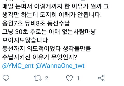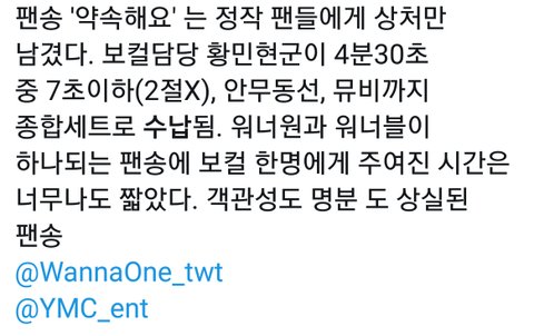 황민현팬들 뷰리풀에서 윤지성팬들이 윤지성 3초밖에 없다고 와엠씨에 항의할때 황민현팬들 ㅈㄴ 욕했었는데 막상 지들이 당하니까 또 그것같고ㅈㄴ욕하네 전체적인 잘못은 와엠씨가 했고 민현이한텐 미안하지만 황민현팬들한텐 꼴좋다
