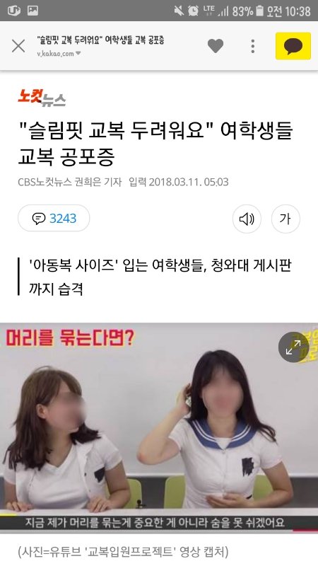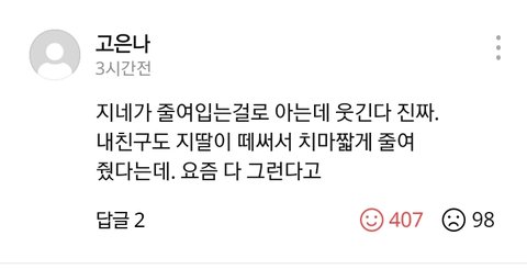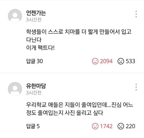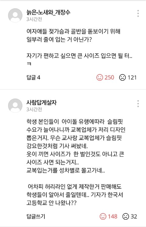 여기서 말하는 문제는 교복 '치마'의 문제도 있지만 더 큰 문제는 윗도리의 문제잖아. 그래서 그걸 그대로 적어넣었더니 자기들이 줄여입어놓고 무슨소리냐, 화장이나 하지마라, 그게 불만이면 더 큰 치수를 사라(하지만 기사에 '더 큰 치수를 사도 불편한건 마찬가지다'라고 나와있음.) 어른들이 만든 교복이 우리가 불편해서 바꿔달라고 하는데 이렇게 말하는 사람들은 꼰대 아니야? 자기들이 그렇게 짧고 얇고 불편한옷 하루종일 입고있으라고 하면 거부할거면서 학생한테 왜 저렇게 말하는지 모르겠어. 또 하복 윗도리는 줄이지 않아도 불편하고 답답한데 그것도 모르면서 말하는것도 너무 싫다 진짜