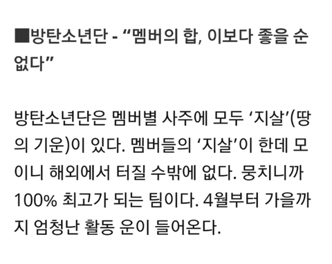이삐들 이거 1월1일에 역술인이 방탄 운세 본건데 그냥 재미로만봐 근데 4월부터 활동운이라는거 맞추긴 했어 저때 아무도 4월일본 컴백 몰랐으니 암튼 4월부터 엄청난 활동 기대해보자