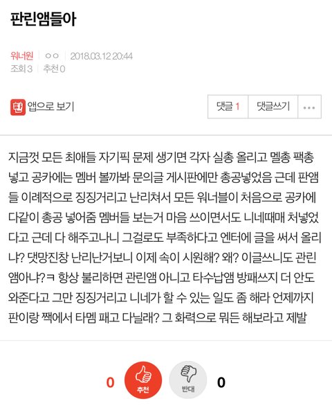 진짜 어뜩하냐 바로 담주가 컴백인데 솔직히 그동안 너브리들이 많이 참긴 했어 아이돌그룹 특성상 뜨는 몇몇 멤버들이 주목 받으며 그룹 알리는 루트 타는게 일반적이긴 한데 우리처럼 활동기한이 정해져있는 그룹 특성상 기존 그룹들과 비슷한 루트로 할 경우 푸쉬못받는 멤버들과 그 최애들은 정말 힘들수밖에 없는 상황이기는 해 그럼에도 이 문제 쉽게 햐걀될거 같지 않고 아마도 지속될 가능성이 높아보여 걱정이다 ㄱㅋ에서 피드백 요구하는거 멤버들 단체편지글로 막는 와가 보니 은근슬쩍 넘어가려는거 뻔히 보여 답답하다 근데 정말 이때 아니면 안될거 같기도 해서 와가에게 피드백 요구하고 있는데 우리원이 너무 걱정돼 얘들이 얼마나 불안할까ㅠㅠㅜ 처음에 앨범퀄리티 높이구 브이앱 자주 해 달라는 요구가 점점 이것도 저것도 하며 불어나는거 같아 어찌해야하는걸까? 이때싶 와가에 다 쏟아붓는게 나은건지 그래두 컴백이니 좀 진정해야하는게 맞는건지 너무 고민된다 자꾸 거론되는 멤버 최애들아 힘내 니들 얼마나 속상할지 알아 눈물날 정도로 힘든거 알아 지친다고 아이들 손 놓지말구 우리 함께 뭐라도 해보자
