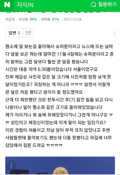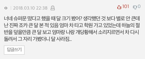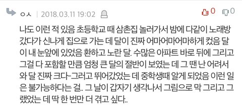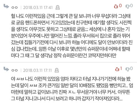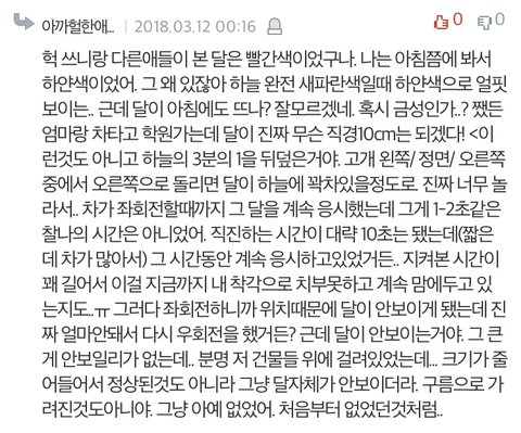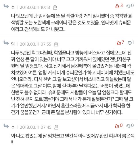 ㅋㅋㅋ나도 보통 달에 여섯배 정도 되는거 진짜 아파트가 있으면 네층을 커버할 정도로 겁나큰 노란색회색?달 운동장에서 봤는데 진짜 우와..하고 처다보면서 가는데 축구하고있던 남고생들이 그거보고 와 시1발 오늘 지구 멸망인가봐!!ㅋㅋㅋㄲㅋ