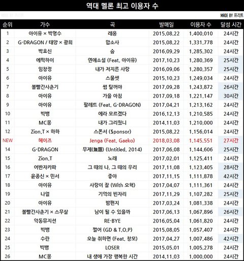 ●성적 이용자수에서 금요일 음원발매의 손해점● 1. 발매하자마자 주말, 즉 출근길 버프를 못받음 2. 주말엔 오히려 이용자수 하락함. (주말 이용자수가 제일 많다고 생각하는 사람들이 많던데 그건 '컴백가수들이 주말에 곡을 발매하는가?'를 생각해보면 알 수 있음) 3. 금,토,일 3일의 수치만으로 주간 1위를 해야하는 위험부담. (아이유같은 음원천상계 가수는 가능하지만 대부분은 불가능한 일임. 3일 1위하고 주간 1위라는 타이틀은..) ☆월요일 오전 7시 무홍보 리멬곡 가을아침 이용자수 금요일 오후 6시 정규곡 팔레트 이용자수 인거 보면 답 나옴☆