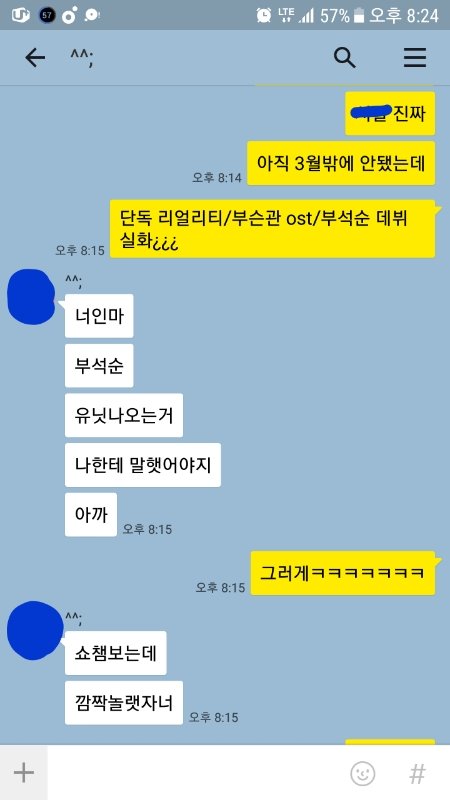 오빠가 기숙사 들어가서 연락 쪼끔 뜸해져가지고 부석순 데뷔하는거 말하는걸 깜빡했는데 아까 숓앰보고 연락왔더라ㅋㅋㅋㅋ