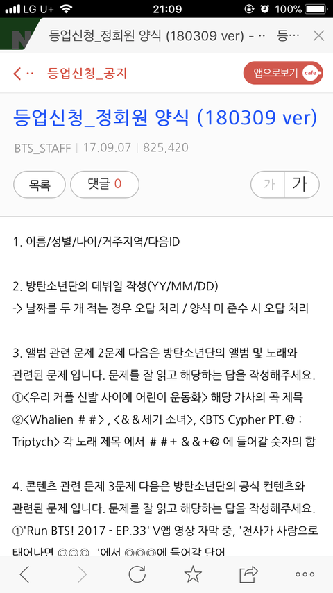 등업신청은 이번주 금토일에 사진에 있는 질문들에 대답해서 양식에 맞게 등업신청게시판에 올리면 신청되는 거얌? 등업은 금방금방 되구? 내가 판녀라서 익숙한 여기에 물어보는 거니까 미워하지 말아줘ㅜㅡㅜ 어차피 팬 될 사람이니까 알려주면 진짜고마울 고 같아 혹시 카페 사진 올리면 안 되는 거라면 바로 지울겜 대답만 해주면 좋겠어유