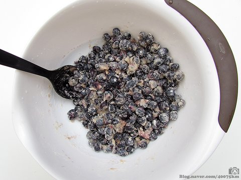 블루베리를 베이킹소다 뿌려서 깨끗하게 씻은 다음, 레몬 반개 분량의 즙을 짜서 넣고, 밀가루와 설탕과 시나몬 파우더를 넣고 잘 섞어주면 됩니다.