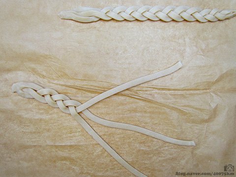 길게 만들어서 한 번에 땋아버리면 좋을 텐데 남은 반죽이 얼마 없어서 짧은 새끼줄을 세 개 만들어 붙였네요.