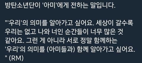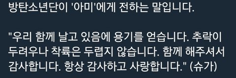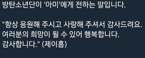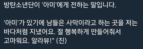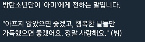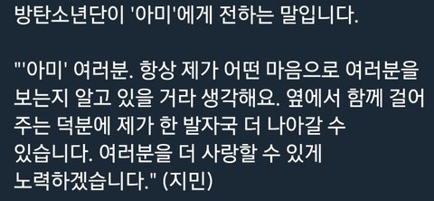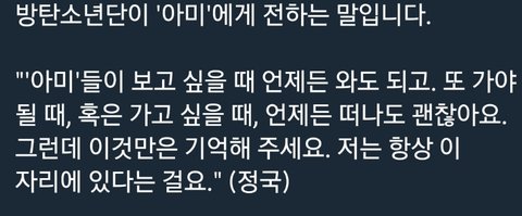 다른 멤들 말 너무 다 감동적이고 저렇게 예쁘게 말 해주니 고마운데... 정국이 멘트 너무 뭔가 조금 슬프다...
