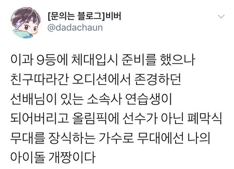 체대준비하던 이과생이 존경하는 선배님이 있는 소속사로 데뷔해서 슈퍼스타를 넘어 국가픽이 된다