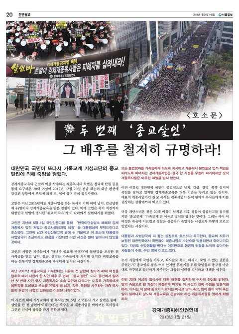 그렇기에 구지인양의 죽음을 이대로 가만히 보고 있을 수 만은 없습니다.대한민국 인권을 유린하는 강제개종목사의 만행을 이 땅에서 뿌리뽑아야 합니다.