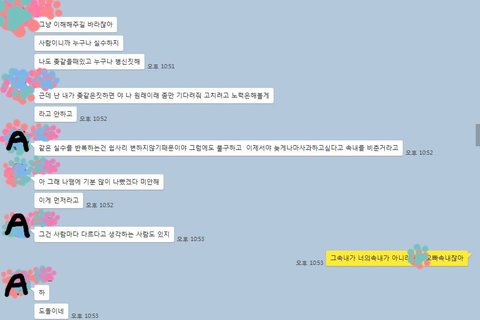저희는 반복되는 욕을 듣고 '그래! a가 나쁜게 아니라 a의 남자친구가 a를 하도 무시하니까 애가 좀 변했나보다!' 싶은 안쓰러운 마음에 돌아가면서 a를 불러내서 토닥입니다. 그리고 그 때 마다 나눈 대화입니다.