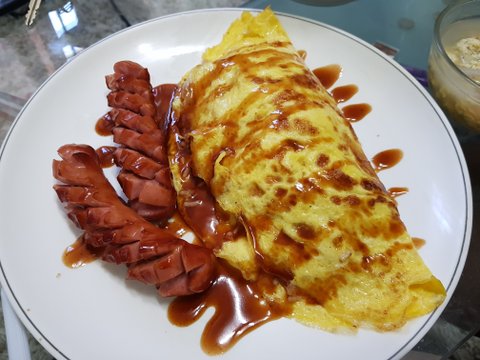 ㅡ오므라이스에.. 나름 소세지를 더해 데코를했습니다. 맛은 돈까스소스가 다 했습니당ㅋㅋ