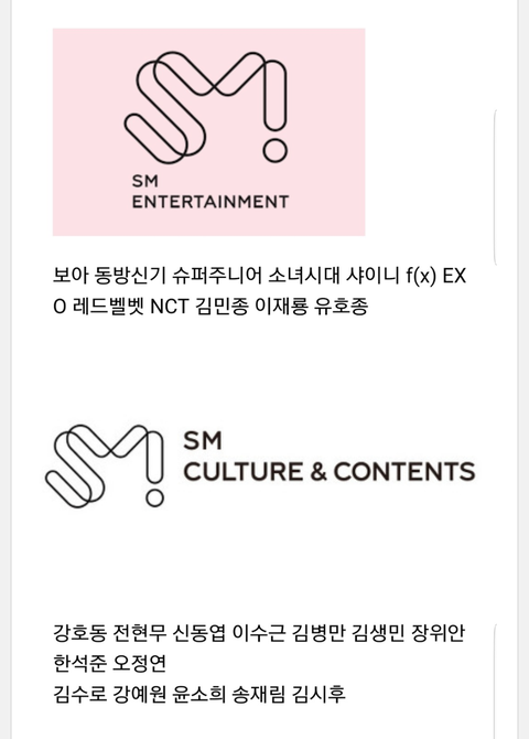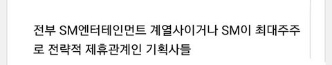 그리고 이외에도 에스엠은 여행사업, 아파트, 온갖 분야에 연관되어 있음...오빠가 레벨 팬이어서 집에 앨범 많아서 아는데 스엠 아티스트 앨범 사본 사람들은 알겠지만 앨범 안에 포카랑 어떤 종이가 들어있을텐데 그 뒷부분 보면 에스엠 회사에 관련된 사업쪽 다 나와있음..그거 보고 감탄했다ㅋㅋㅋㅋㅋ와...생각보다 스케일이 커서 ㅋㅋㅋㅋㅋㅋ 에스엠은 연예계에만 손 뻗은게 아님...진짜 대박이여 ㅋㅋㅋㅋㅋㅋㅋ