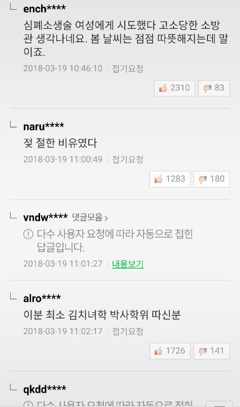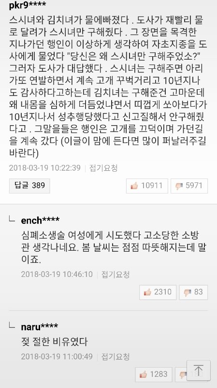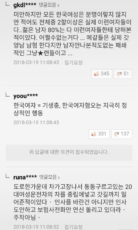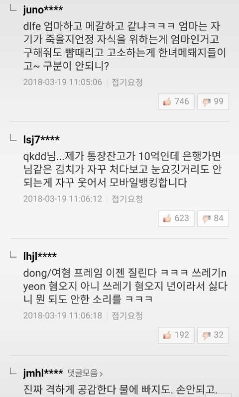 다수 사용자 요청으로 접힌 댓글은 다 여자들이 쓴 댓글임 진짜 미친거아님? 언제는 김치녀가 일부 무개념인 여자 지칭하는 거라면서 여기서는 모든 한국여자들 싸잡아서 욕하는중ㅋㅋㅋ 웃긴건 말리는 댓글 1도 없고 다 동조하는거 난 여태 한남충 단어 지양하자고 해왔는데ㅋㅋㅋ 솔직히 인터넷하면서 한남충 쓰지 말자고한 여자는 판에서라도 많이 봤는데 김치녀 쓰지 말자고 한 남자는 한 번도 못 본듯 오히려 조롱했지 내가 처음으로 메갈 소리 들었던 때가 김치녀 쓰지 말라고 했을때임 젊은남자 80%가 이런 여자들한테 당해봤다고? 여자들이 젊은남자 80%한테 성추행 성폭행 당해본 경험 있다고 하면 예민하다 그게 말이되냐고 메갈로 몰아갈거면서... 대댓글 300개 정도 달렸었는데 다 봤다가는 멘탈 나갈거 같아서 몇개 가져왔는데 진짜 토나올지경ㅋㅋ