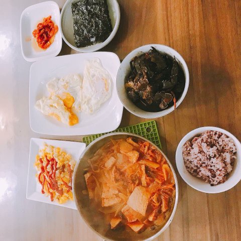 김치찌개+간장게장+계란스크램블+오징어젓갈+계란후라이
