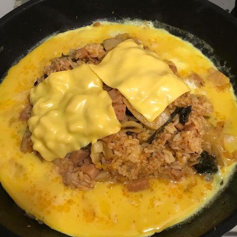김치볶음밥에 치즈를 올리고 계란을 부은겁니당!