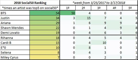 1년동안 1~5위를 몇번했는지로 소셜후보를 뽑는데 후보발표까지 3주정도 남았으니 아마 저기록에다가 3주간의 기록을 추가해서 후보를 뽑겠지만 일단 우린 54주로 압도적이라 백퍼 후보들고 우리가 갑자기 100위를 한다던지 99위를 하지않으면