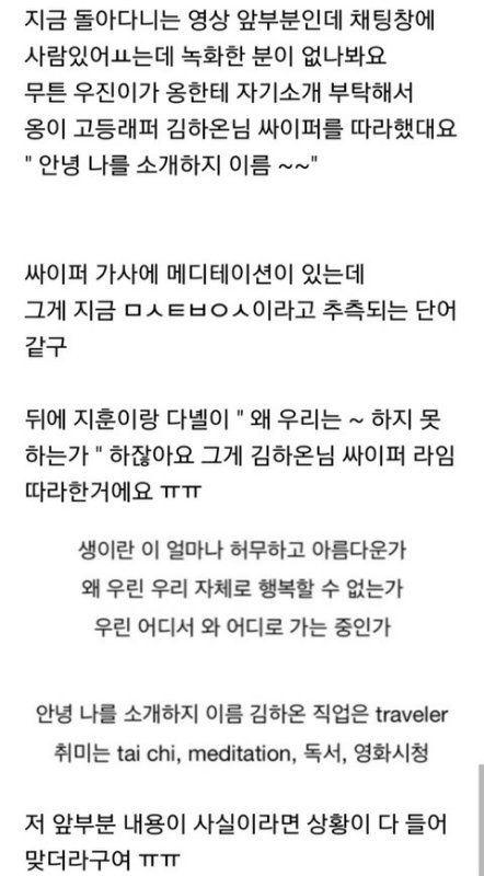 자기 최애 구하겠다고 옹성우 머리채 잡네. 옹 입도 안벌린 부분가지고 정치질 뚝딱하질 않나 있지도 않은 영상 운운하며 랩 했다고 소설을 쓰지않나