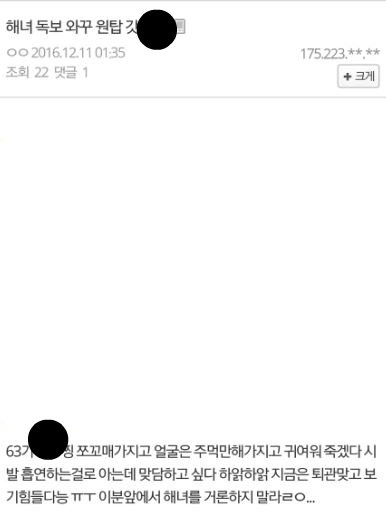 딸을 치고싶다, 꼴린다 라는 둥의 성희롱을 비롯해 실명을 직접적으로 언급하는 글들이 다수였습니다.
