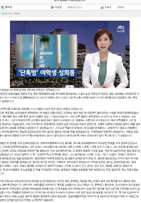 얼마전 국민대학교에서도 이와 유사한 일이 있었던 걸로 압니다. 국민대 사건때는 언론에 올라오니 여학생들을 옹호하는 댓글들이 잔뜩이었는데, 저희학교에서 언론에 올라오니 '지잡대 클라스가 그렇지'라는 댓글이 대부분이더군요. 단한번도 지잡대라고 생각해보지 않았는데, 이번일 겪으니 저희학교는 지잡대가 맞는것같습니다. 하지만 이제서라도 개선되었으면 합니다.