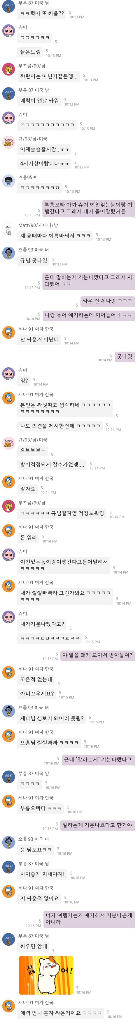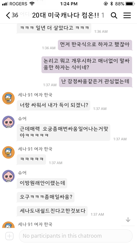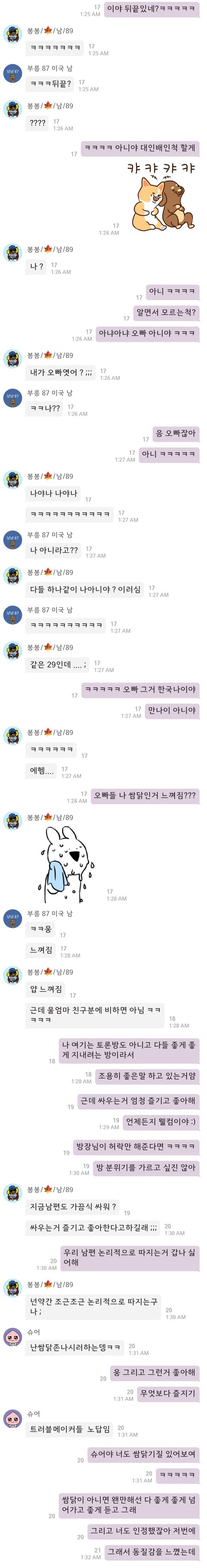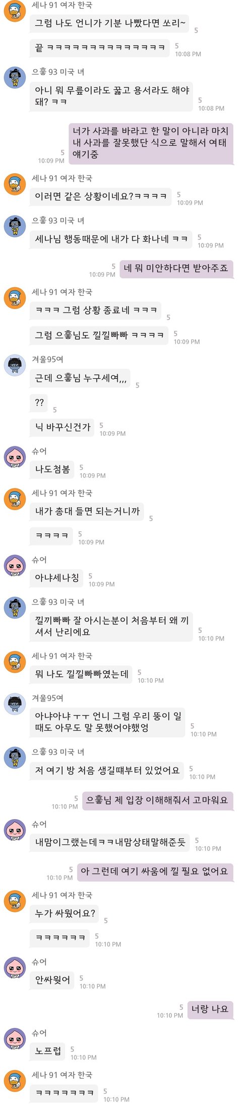 +추가대화내용에 내가 싸운 경험이 여러번 있는 것 처럼 말이 나오지만 말싸움 이번이 처음.오히려 싸움은 슈어라는 여자애가 다른 사람들과 이미 여러번 했고 그 대상들은 강퇴당하거나 나감.