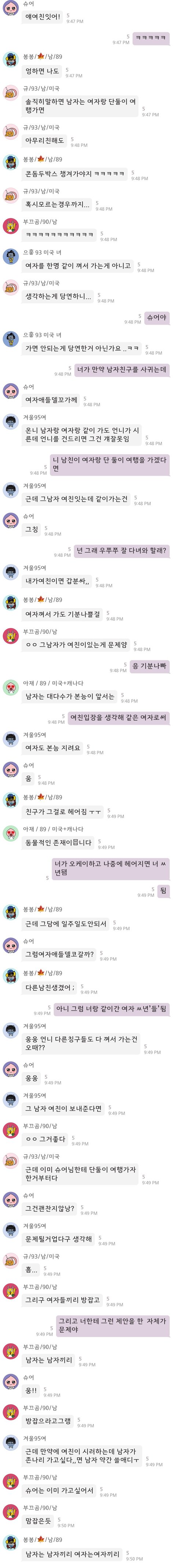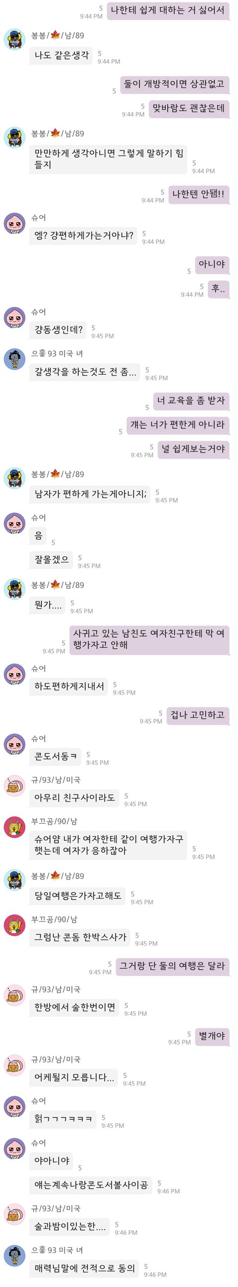 간단히 정리해서 설명하자면,오픈톡방에 있는 한 무개념 여가 난데없이 남자에게 여행 제안을 받았다고 던짐처음에는 '오, 그린라이트?' 반응이 나왔는데 그 여자애는 부정함.이유는 그 남자는 여자친구가 있기 때문! 다들 벙짐. 근데 왜 단둘이 여행을 감? 무개념녀 왈, 아무 사이 아니라서 괜찮음.