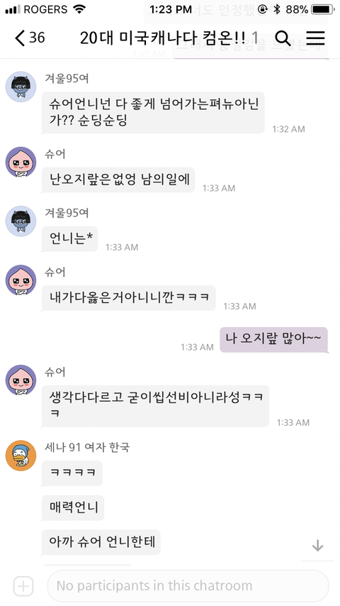 (글쓴이)매력: 여자/ 90년생/ 유부녀, 오지라퍼, 무개념보면 그냥 넘기질 못함슈어: 여자/ 90년생/ 토론토 아일락 어학원 다니는 중세나: 여자/ 91년생/ 카페 운영 중, 터키 한국 이중국적 (본인 한국말 못한다고 하고다님)겨울: 여자/ 94년생/ 늘 외로워하고 본인 지적당하면 '그냥 해본소린데'하고 넘김