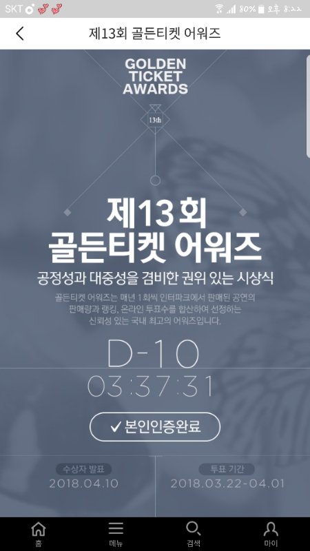 인터파크 티켓 앱으로 들어가면 팝업창으로 골든티켓어워즈 투표하기가 뜰거야.