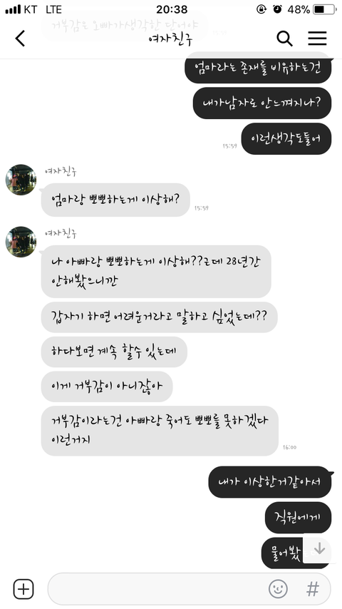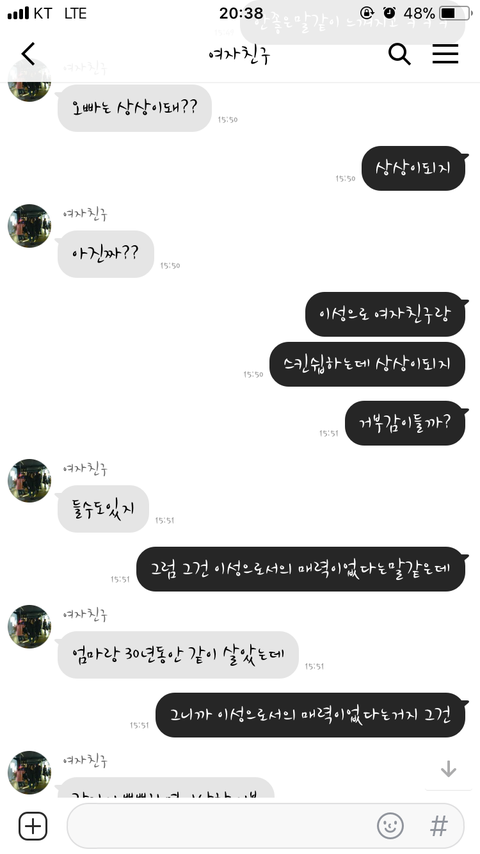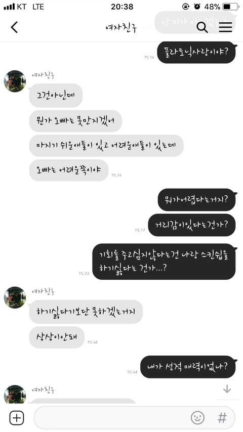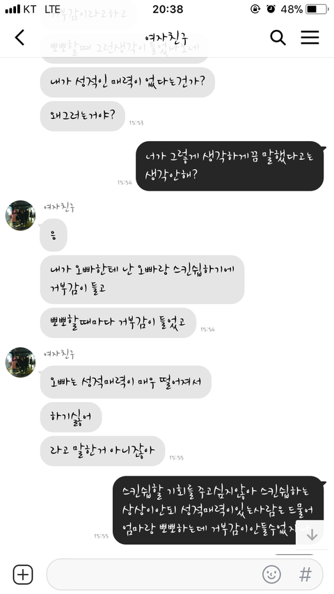 남친이 나한테 스킨십 할 생각이 안들고 엄마랑 뽀뽀하는것과 같다고하면 정뚝떨임 여기 천사들 많네. 본인남친이 너랑 스킨십은 아직 좀 힘들어 어려워 그러면 뭐지 내가 여자로서 매력이 없는건가? 느끼는게 당연한거 아니냐 ㅋㅋㅋㅋ 뭐 한 10년된 부부냐? 본인이 티비 드라마에서 보던 이상형의 연예인이 와서 스킨십해도 과연 똑같을까 ㅋㅋㅋ? 그냥 부정하는거임 아냐 난 남친한테 성적매력을 못느끼는게 아니야 그냥..그냥 하기싫은것 뿐이야.. 아직은.. 이라고 생각하겠지. 연애감정은 갈수록 식는게 당연한 이치임 항상 처음과 똑같이 열렬할순 없지. 근데 처음에도 못느끼는 감정을 1,2년 익숙해져가면서 느낄수있을까 ㅋㅋㅋ 잘생각해보셈 여친은 지금 남친을 사람으로서 좋아할순 있어도 남자로서 좋아하진 않는게 팩트임.