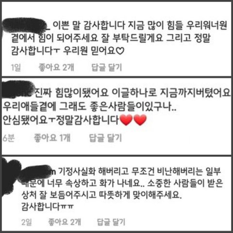 워너원이 스탭한테 막 대한다고 상황궁예하던데, 현장스탭이 직접 워너원이 욕설 및 19금 발언 안 했다고 인스타 올리셨고, 댓글에서 워너원 보고 '소중한 사람들'이라고 해줌. 어젠 헤어메이크업 원장쌤이 인스타에 '흔들리지 않는 꽃'이라는 시도 올려주셨음. (시 전문이랑 같이 시의 한 부분인 '바람과 비에 아프지말고 누구보다 예쁜 꽃잎 따뜻하게 피어나길'이라고도 어제 따로 올려주셨어.) 그리고 첨부한 사진 속 인스타 댓글 3번째에 스탭분이 다신 댓글 보면 알겠지만,
