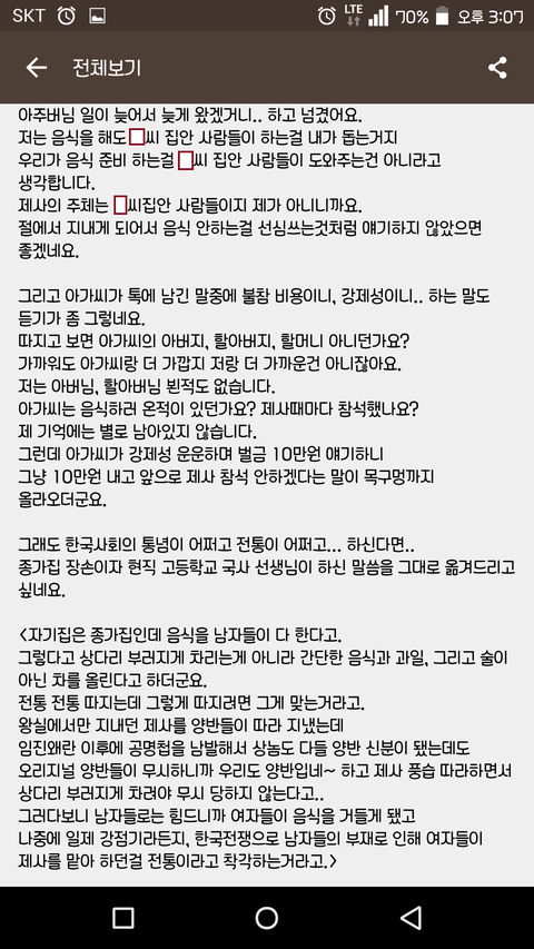 거기다 아가씨는 한술 더 떠서 집에서 음식을 안하다 보니 한번 두 번 빠지다 보면 앞으로도 참석 안하는것에 대해 쉽게 생각할 수도 있다며 강제성이 필요할 것 같다고 함. 벌금 10만원 정도 내는걸로.. 제사 비용을 계비에서 내는데 (50만원) 그렇다면 본인은 혼자니 엄마랑 편먹고 한집으로 봐줘야 형평성에 맞겠다는 말을 남김.