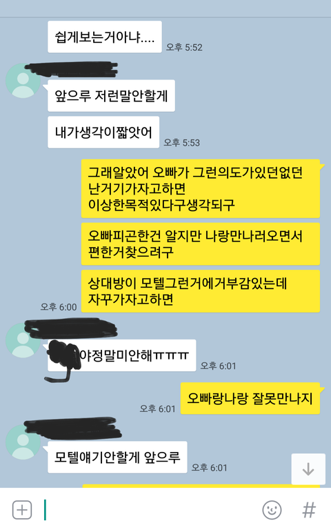 저는 성관계목적인게 궁금한건아니구요 성관계목적이든 아니든 그거랑 별개로 자기 편하자고 대실해서 놀자는게 이기적인거같고 저 쉽게보는거같거든요 그리고 데이트할려고 화장하고나와서 해봤자모텔가기싫구요 그때 미안하다고사과는 하길래 일단넘겼는데 저는 속에 그게좀 담아져있어서 그때그거 그냥 나쉽게보는거아니냐고 아까물어봤더니 지난얘기왜하냐고승질내서 제가인터넷에올리겠다고했어요