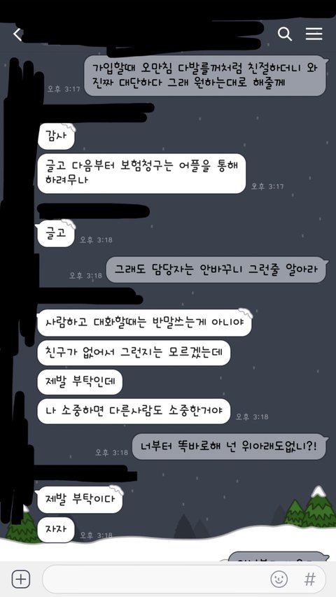 저도 그때 저희 어머니한테 경우 없이 말했다는 거에 너무 화가 나서 설계사한테 전화해서 화냈었고요. 그 설계사 뻔뻔하게 저한테 하는 말이 보험설계 담당자 바꾸라고 하더군요.